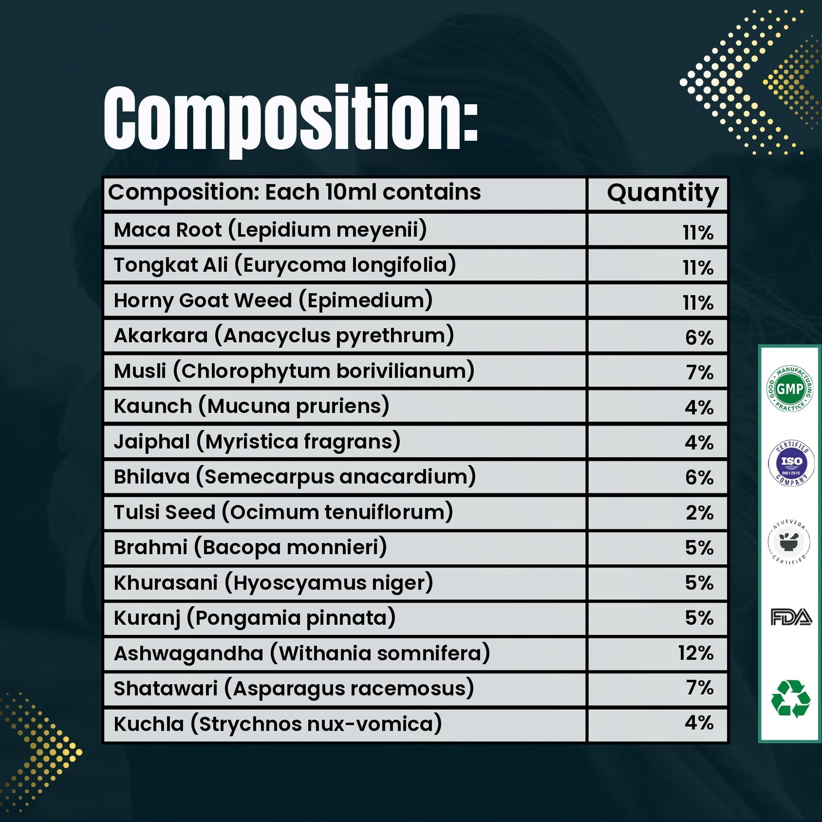 Maca Root, Tongkat Ali, Horny Goat Weed, Akarkara, Musli, Kaunch, Jaiphal, Bhilava, Tulsi Seed, Brahmi, Khurasani, Kuranj, Ashwagandha, Shatavari, Kuchla